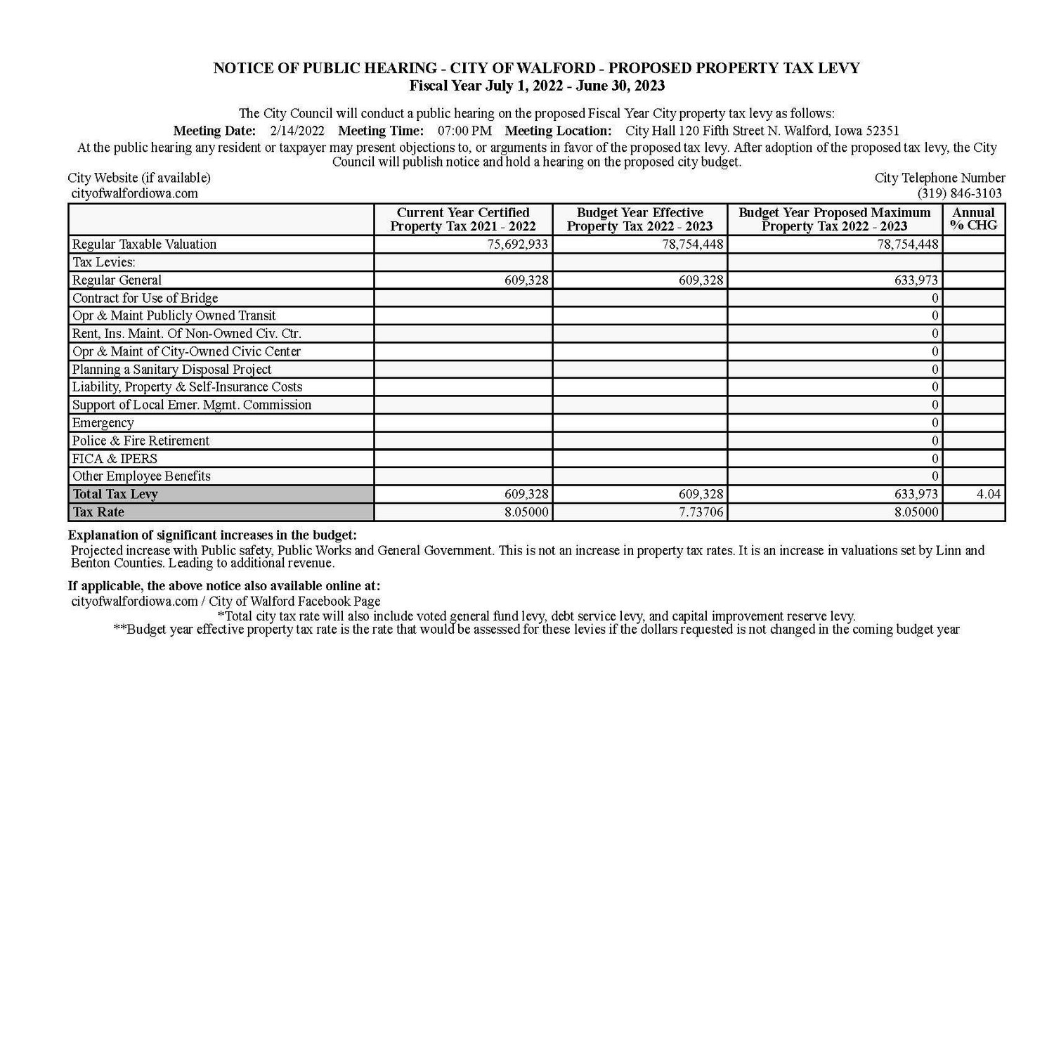 2022 TAX LEVY NOTICE NOTICE OF PUBLIC HEARING - CITY OF WALFORD - PROPOSED PROPERTY TAX LEVY Fiscal Year July 1, 2022 - June 30, 2023 Notice, Public Hearing Tax LevyTyce HoskinsFebruary 1, 2022 Facebook0 Twitter Pinterest0 0 Likes