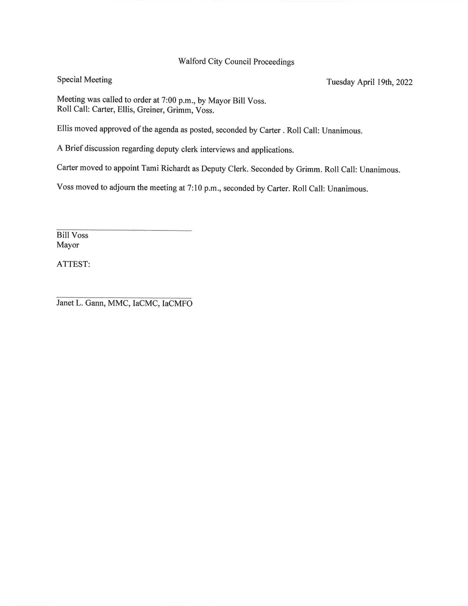 Carter moved to appoint Tami Richardt as Deputy Clerk. Seconded by Grimm. Roll Call: Unanimous.